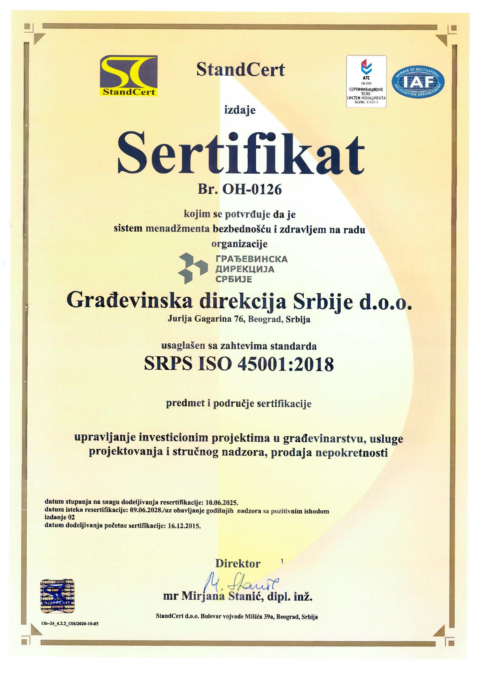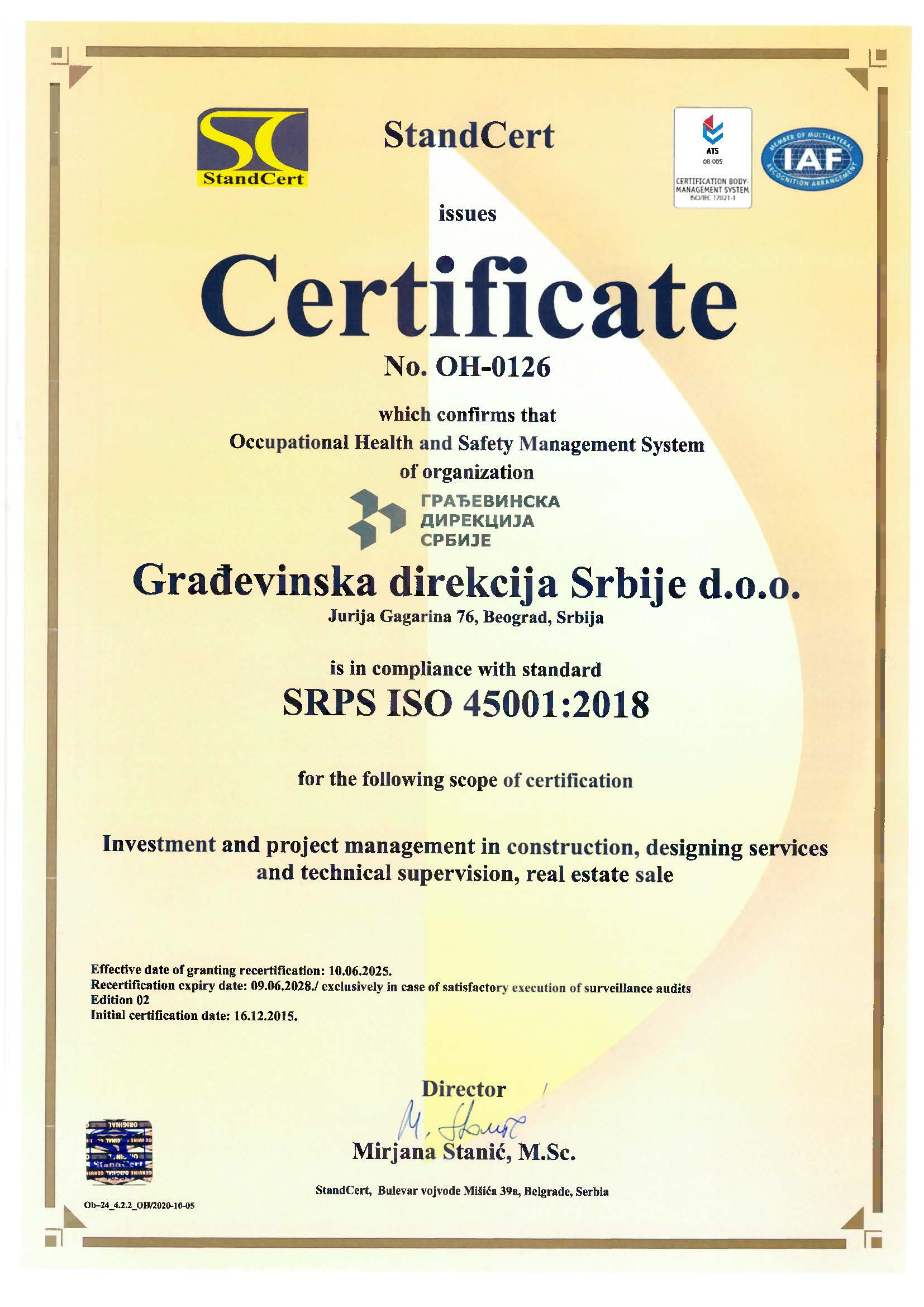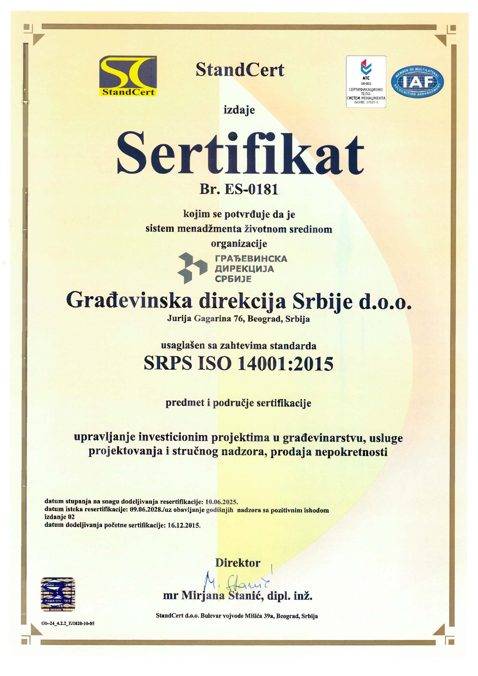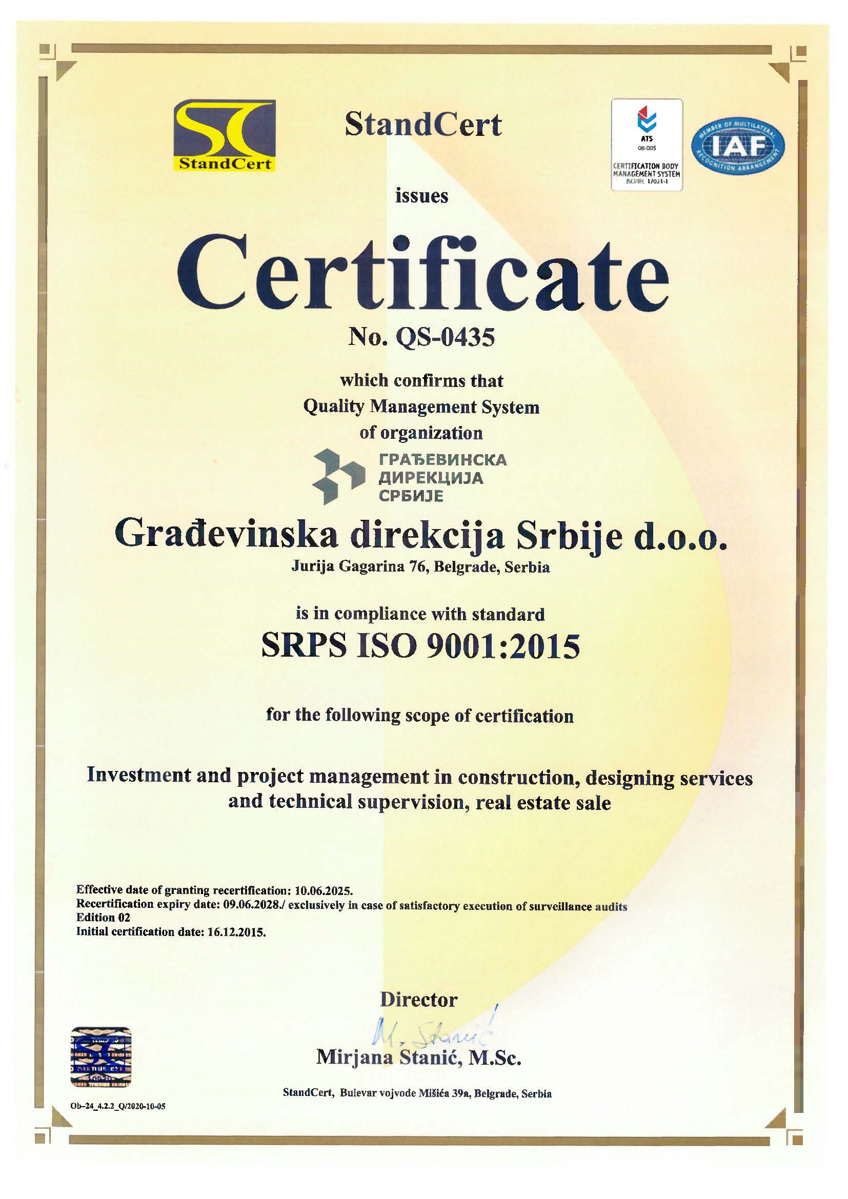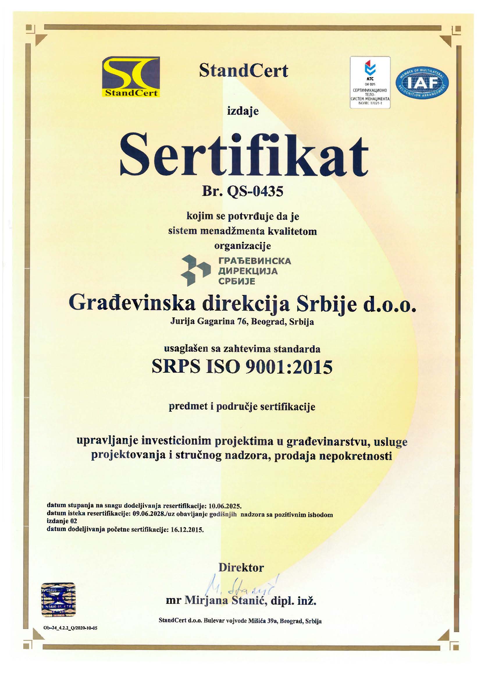 Građevinska direkcija Srbije d.o.o. od kraja 2015. godine primenjuje, održava i konstantno unapređuje Integrisani sistem menadžmenta (IMS) koji čine sistem menadžmenta kvalitetom (QMS), sistem menadžmenta zaštitom životne sredine (EMS) i sistem menadžmenta zaštitom zdravlјa i bezbednošću na radu (OH&S), saglasno zahtevima standarda ISO 9001:2015, ISO 14001:2015 i ISO 45001:2018.